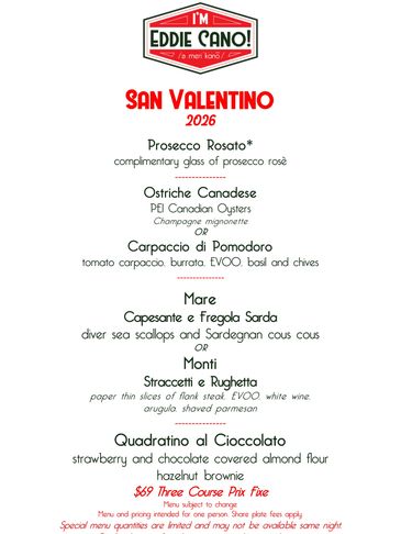Reservations and pre-payment required for the special menu. Cocktails and Vino can be selected and paid for the evening of your reservation.